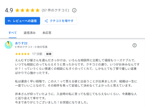 クチコミの通り、いつがお休みなんですか?!っていうくらい夜遅くの相談にもすぐのってくれて、しかもとても丁寧で優しい返事ばかりで心強かったです。